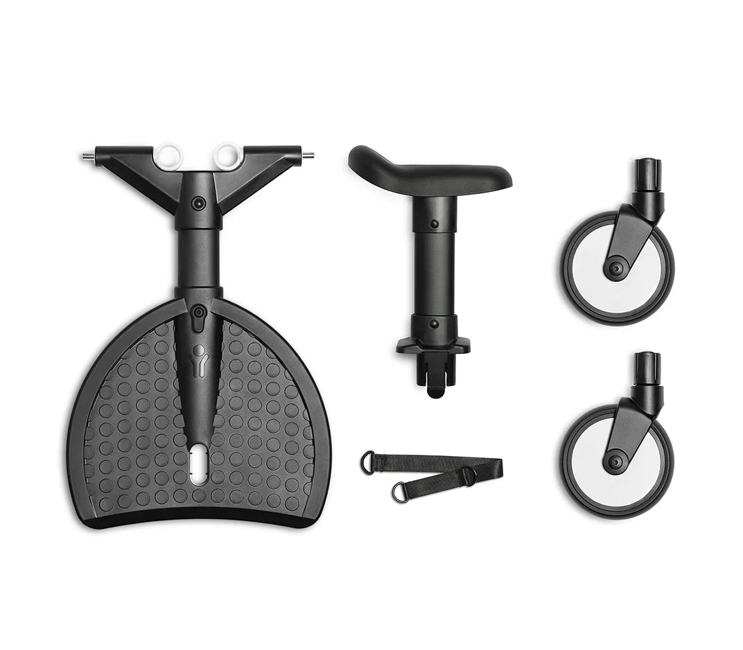 - يجلس الطفل بأمان تام، مع إمكانية الاختيار بين الوقوف أو الجلوس على سرج قابل للإزالة بسهولة.